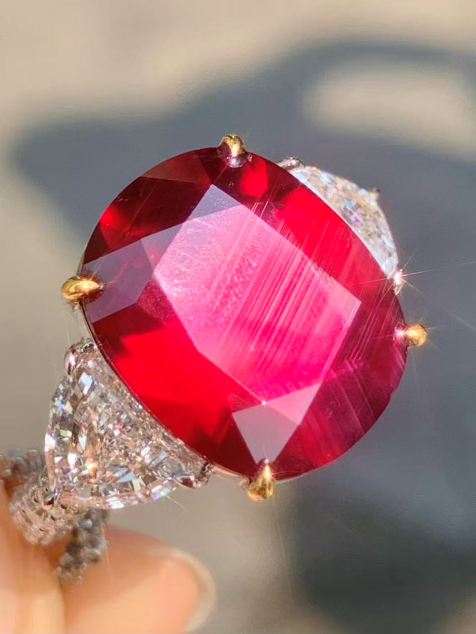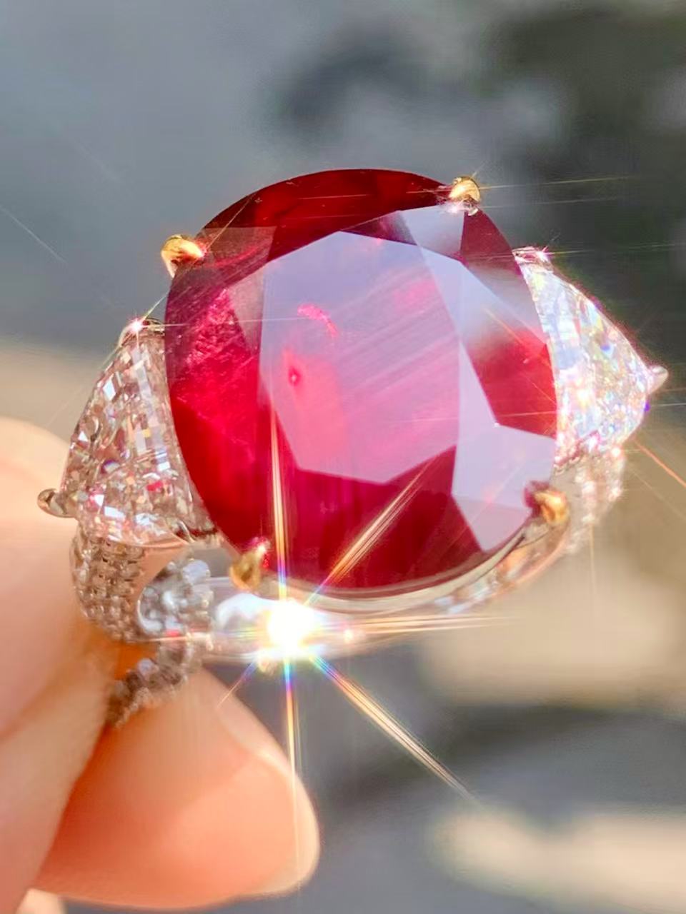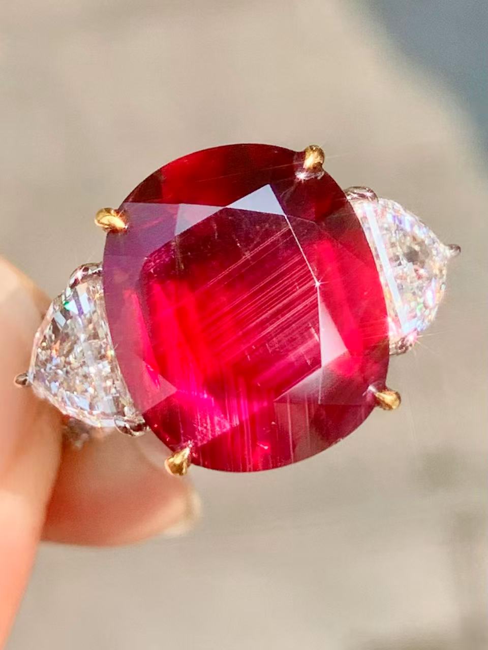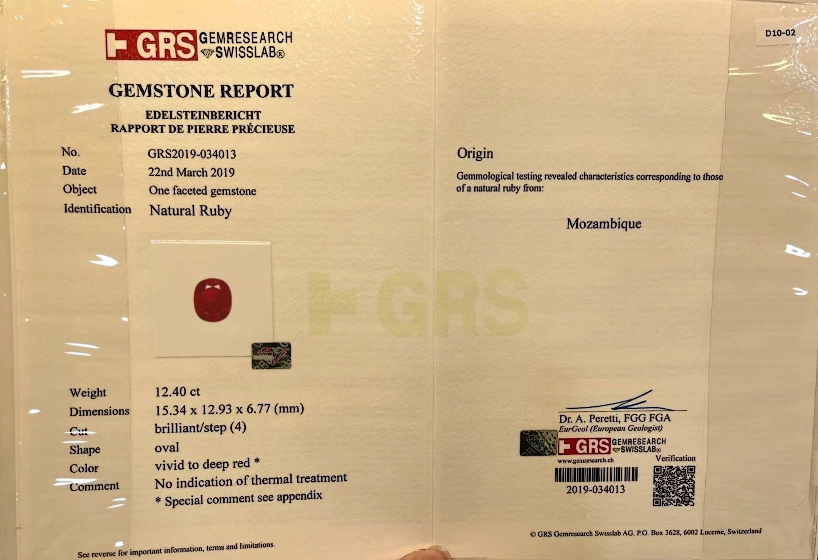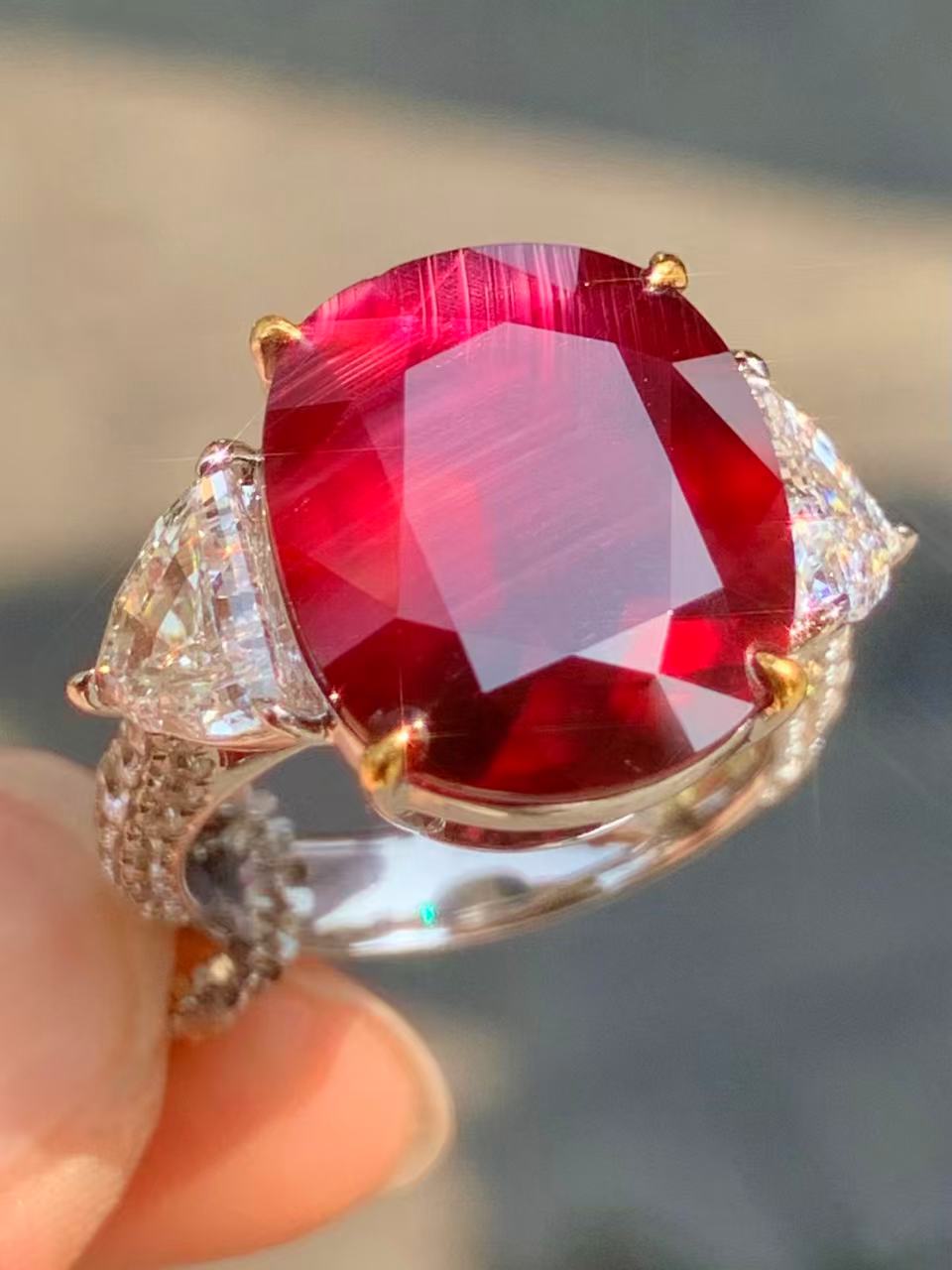 12.40 carats! Huge table! Unheated Mozambique pigeon blood ruby ring! GRS certified! Top-quality crystal glass! Entirely clear! Except for the rutile pattern, the glass is entirely clear, with only rutile color bands! Flawless! Full fire! Paired with a 2.72 carat high-quality diamond and two GIA one-carat-plus triangular diamonds, E color VVS! Absolutely beautiful and exceptional value! Weighing 9.35 grams, 18K karat construction! Loose stone: 15.34 x 12.93 x 6.77 mm, overall dimensions: 23 x 15.4 x 9.1 mm. Exclusive, classic, and elegant design! Absolutely stunning!