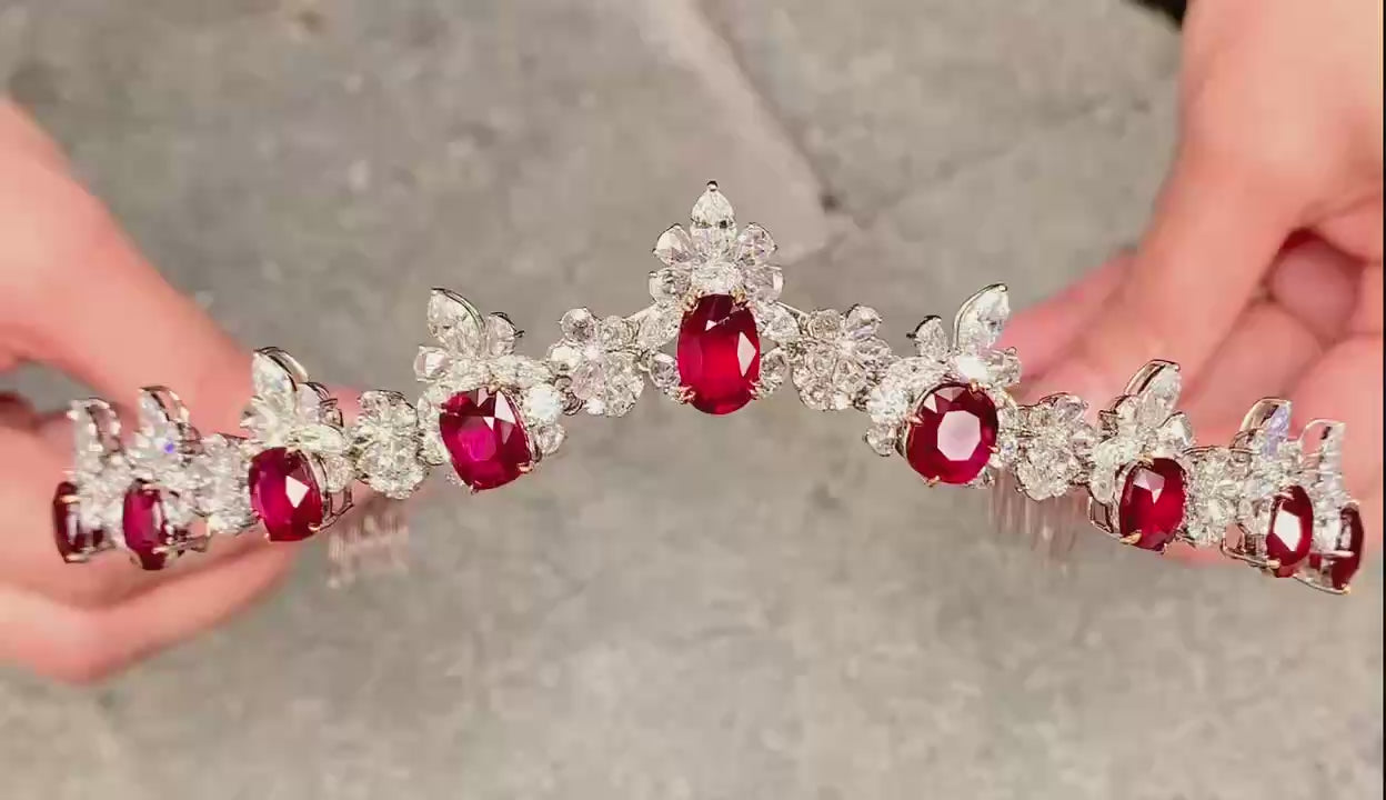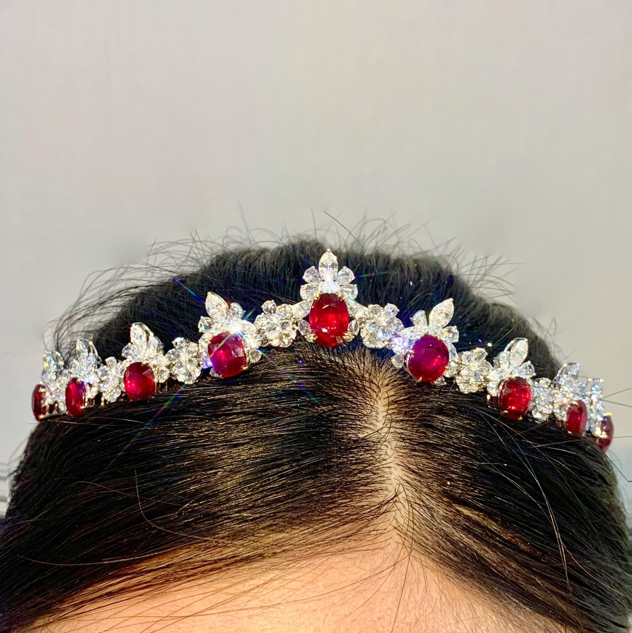 Exclusive original ruby crown, widened and bolded, dual-use necklace and crown. Numerous large diamonds, each of them high-quality. Each ruby is over 3 carats of unheated Mozambican pigeon blood ruby, each one full of fire! Clear glass! Large surface! AIGS certificate, top-quality vivid red color! Rubies total 27.905 carats, diamonds total 18.478 carats, weighing 123.38 grams (including accessories)! Set in platinum! Perfectly flawless!