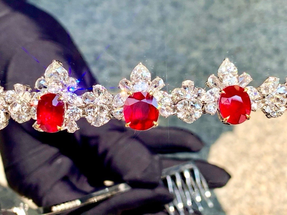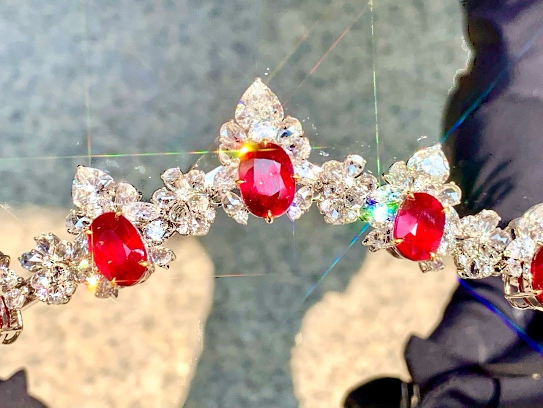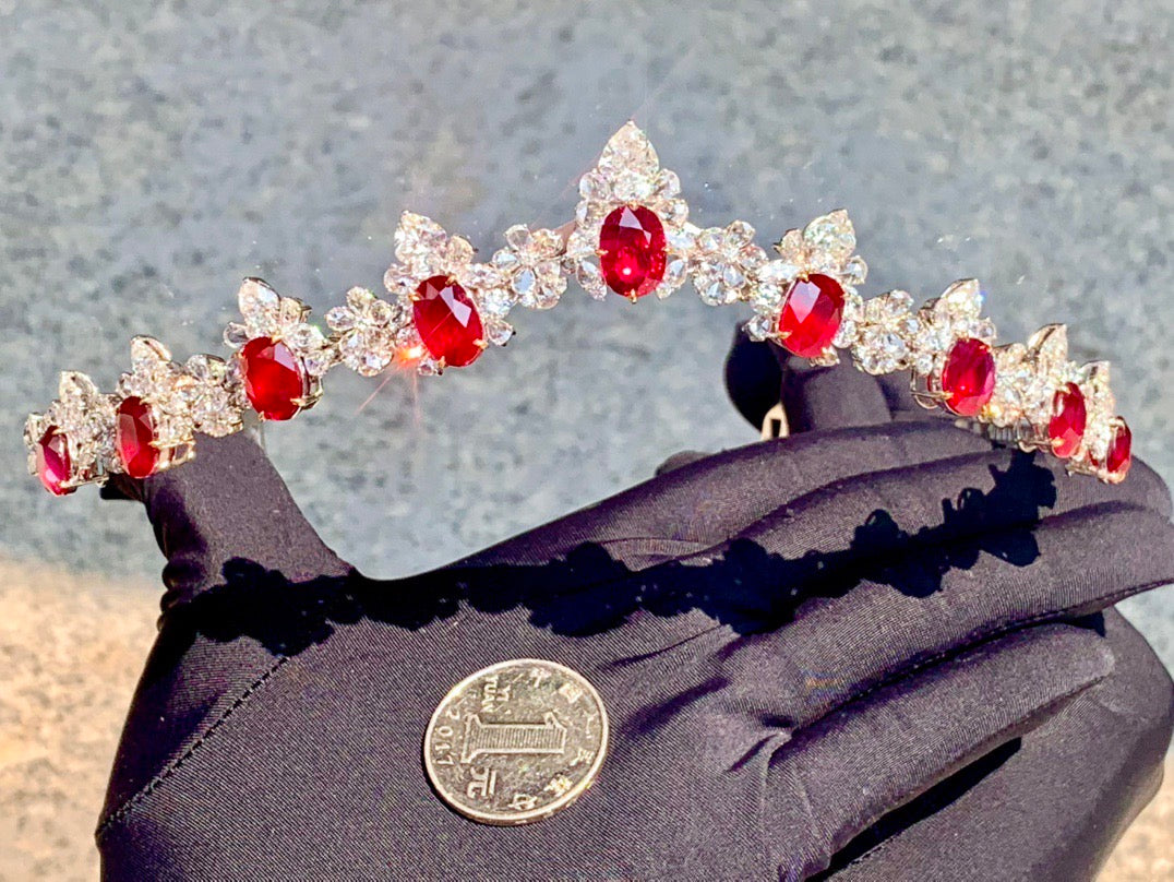 Exclusive, original, dual-use model features a high-quality heart-shaped diamond, measuring over 1 carat. It comes with two GIA certificates. Each ruby is over 3 carats of unheated pigeon's blood ruby from Mozambique, featuring top-quality vitreous crystals and a top-quality vivid red color. Pigeon's blood is available on most GRS platforms. The largest loose stone measures 10.42 x 7.69 x 3.93mm, while the smallest measures 9.93 x 7.80 x 3.89mm. The rubies total 27.860 carats, the diamonds 22.256 carats, and the total weight is 128.73 grams (including accessories). The large tabletop is luxuriously crafted in a platinum setting!