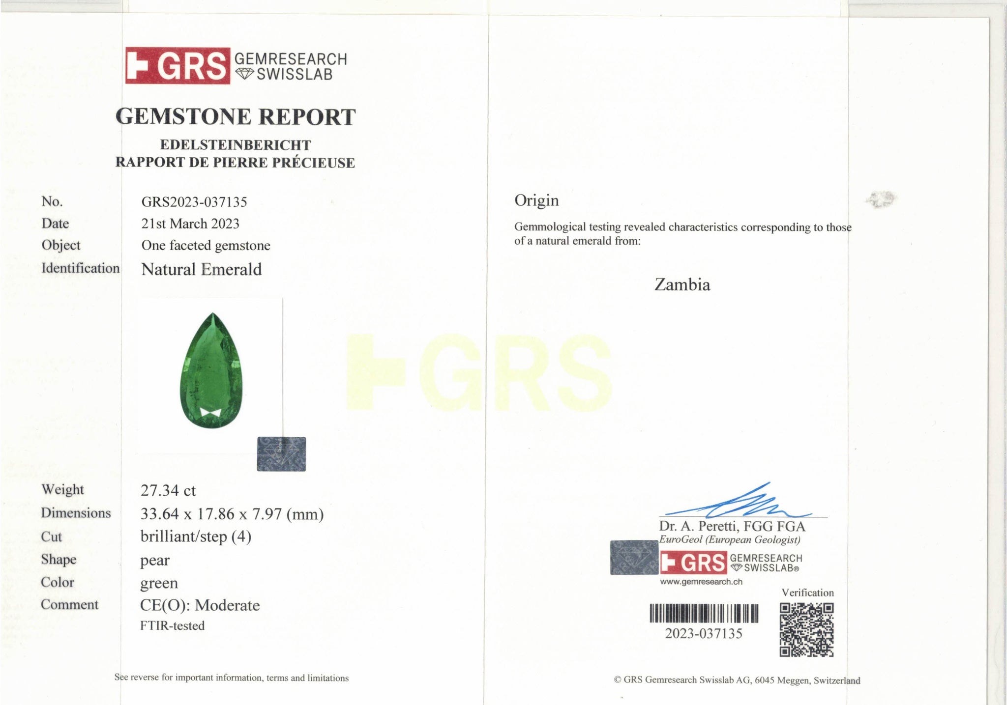 Natural Zambia Modearte Emerald 27.34 cts Pear by SR-Takat